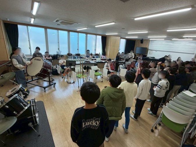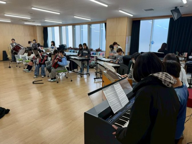 木きんや鉄きん、ピアノやアコーディオン、たいこなどの様々な楽器を使って練習をしています。2月には発表会があるので、たくさんの人にすてきな音楽を届けることを目指して活動しています。