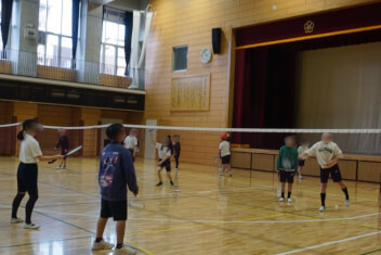 ラケットの持ち方確認、素振り、コートを使って練習(サーブ、ドライブ、クリア)、練習試合などをしています。