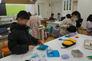 手縫いやミシンを使って好きなものを作っています。自分たちで作りたいものを考え、材料を準備します。6年生が4年生に縫い方を教えたり、でき上がった作品をみんなで見せ合ったり、楽しく活動しています。