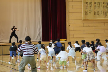 続いて、ダンスの基礎となる【アイソレーション】を学びます。先生が丁寧に説明するポイントに耳を傾け、友達と一緒に動きを真似しながら、みんなでダンスの楽しさを共有しました。その後も【ダウンドリズム】や【ランニングマン】など、さまざまな動きに挑戦。子どもたちはどんどんダンスの世界に引き込まれていきました。