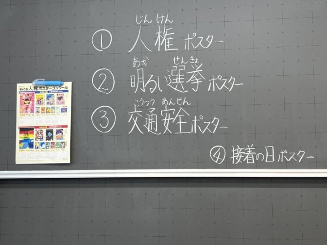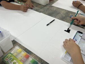 図工教室では、夏休みのコンクールへ出品する作品の制作の場として開放されていました。ポスター作りに励む子供たち。ただ絵を描いているわけではなく、社会において考えるべき内容をお友達と話し合いながら考案していました。学校で行われた「交通安全教室」で学んだことをポスターにしている児童もいて、学んだことがしっかりと活かされていることに嬉しくなりました。