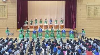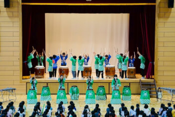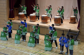 緑と青の法被を着たお囃子クラブの子供たち。つい先日、地域の神社でお囃子を披露をしてまいりましたが、この日は日ごろの練習の成果を、全校児童に披露しました。
