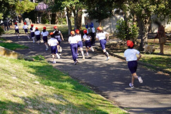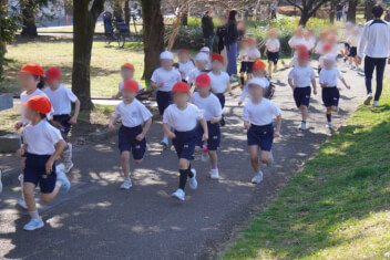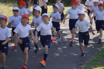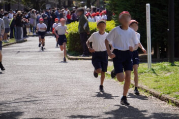 1年生は、小学校で初めての「持久走大会」。先頭のランナーたちは、先導する先生にしっかりと付いていきます。ニコニコしながら楽しそうに走っている子、手足を一生懸命振って食いしばりながら走っている子、靴を直すのために止まる子。どの子もみんな、ゴールすることができました!