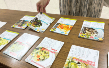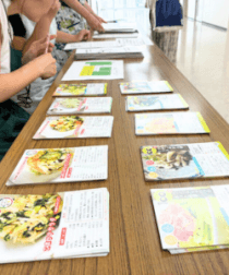 まず受付では、足立区より配布されているカラフルなレシピカードが数種類用意され、参加者は自由に持ち帰ることができました。家庭での食事づくりにも役立つ素敵な資料です。皆さん興味深く手に取っていました。