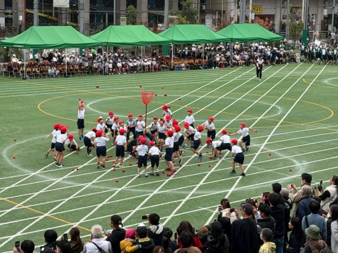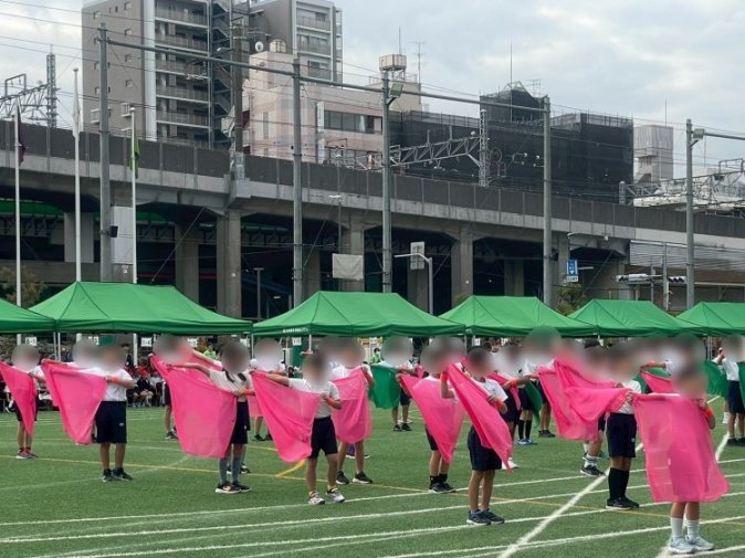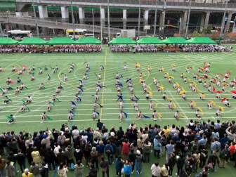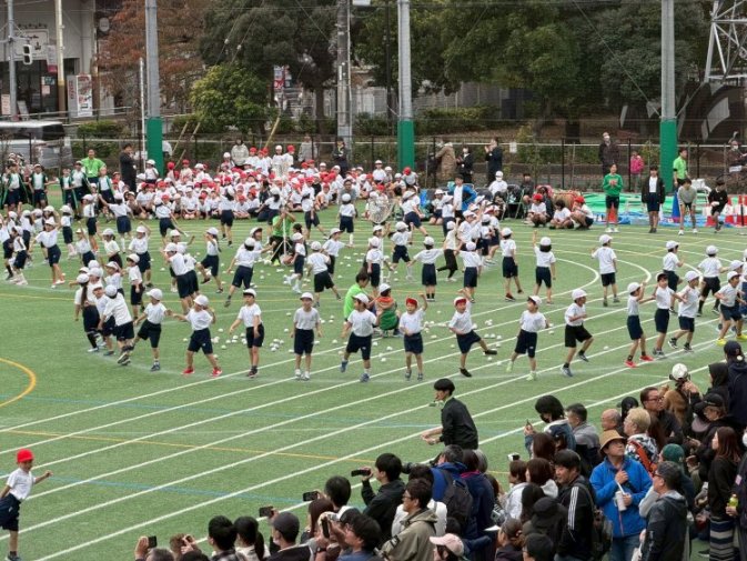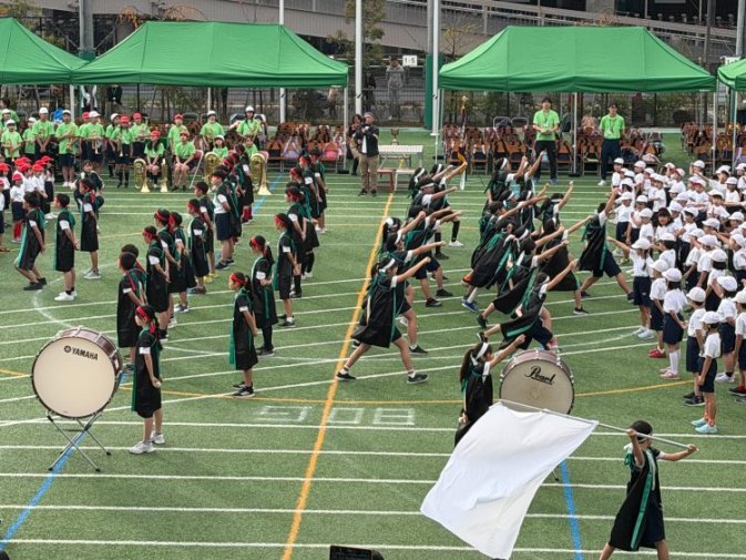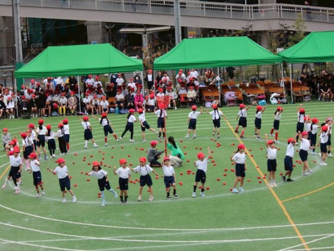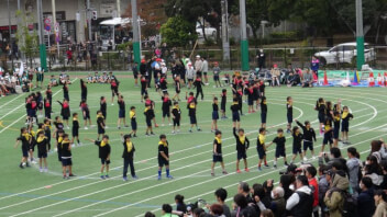 お昼休みの後は、 午後の部のトップバッターとして、 表現運動『リズムにのれ!LetʼsParty』を、弾けるような笑顔で表現し切りました。全員⿊い T シャツを着て、組ごとに赤色、黄色、青色、緑色、桃色の5⾊バンダナをつけています。 ⾊鮮やかな「五つの輪」になって、 観客からの⼿拍⼦を受けて踊る様⼦は圧巻。五輪から世界を想像させるようなスケールの⼤きい表現で、 平和を願い、 協調性の⼤切さを感じさせる素晴らしいメッセージを届けてもらった気持ちです。