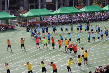 『開会式』の後は、プログラム1番『全校体操』です。係の児童たちが体操のお手本をしてくれる中、全員でしっかりとウォーミングアップをして準備は万端!