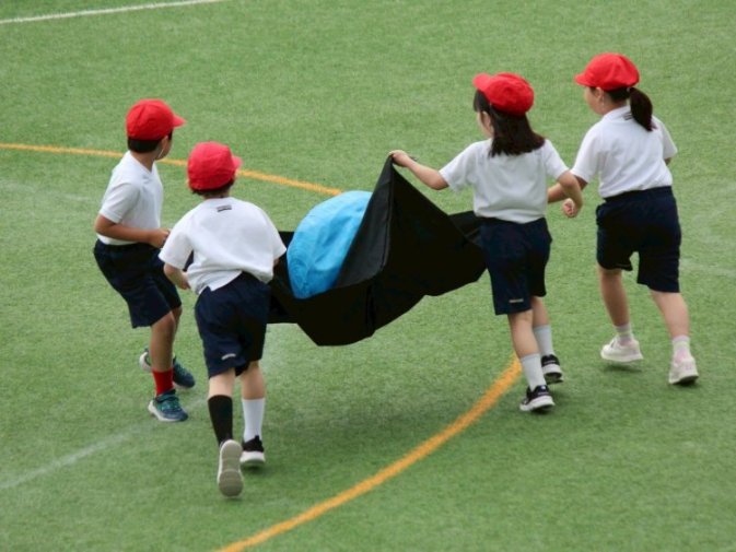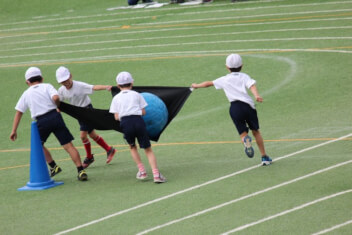 2年⽣の最初の登場種⽬は 、団体競技『⾛って!つないで!⼤⽟はこび!』です。 4⼈1組となり、 その 4 ⼈それぞれが、 ⼤⽟が載った敷物の四隅を持ちながら 「⾛って!つないで!運ぶ!」 競技です。 4⼈の呼吸が合わない時は ・・・ おっとっと!⼤⽟が落ちてしまいます。⾚、 ⻩、 ⻘、 ⽩の4チームに分かれて、 ハラハラドキドキしながらみんな頑張りました。 結果は⻩⾊が1着でゴール、 ⾚は2着、 ⽩は3着、 ⻘は4着ということで、 この競技は赤組の勝ち!