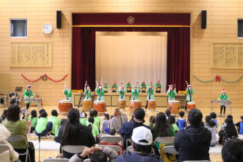 1曲目に『ぶち合わせ太鼓』を披露しました。この『ぶち合わせ太鼓』は、三浦半島に伝わる大漁を祈願した太鼓で、昔は漁師たちが村ごとに大漁を祈り、競い合いながら心をひとつにして太鼓を叩いたといわれいるそうです。11月から練習を始めたばかりなのですが、はじめはゆっくり堂々と、おなかの底から響く太鼓の音が徐々にテンポアップしていき、最後には迫力満点!「どっこいどっこい!」という掛け声と太鼓の掛け合いに、見ている観客側のテンションもぶち上がりました。